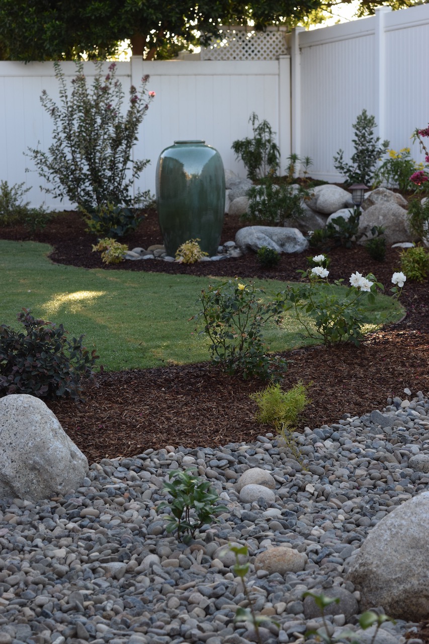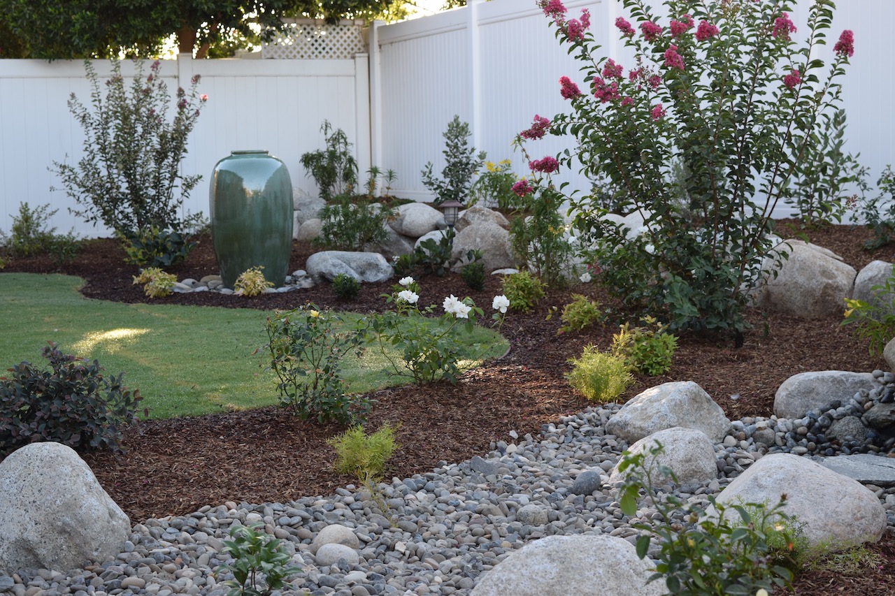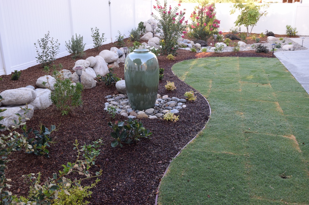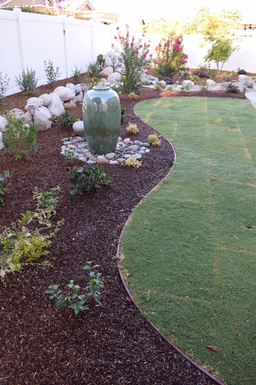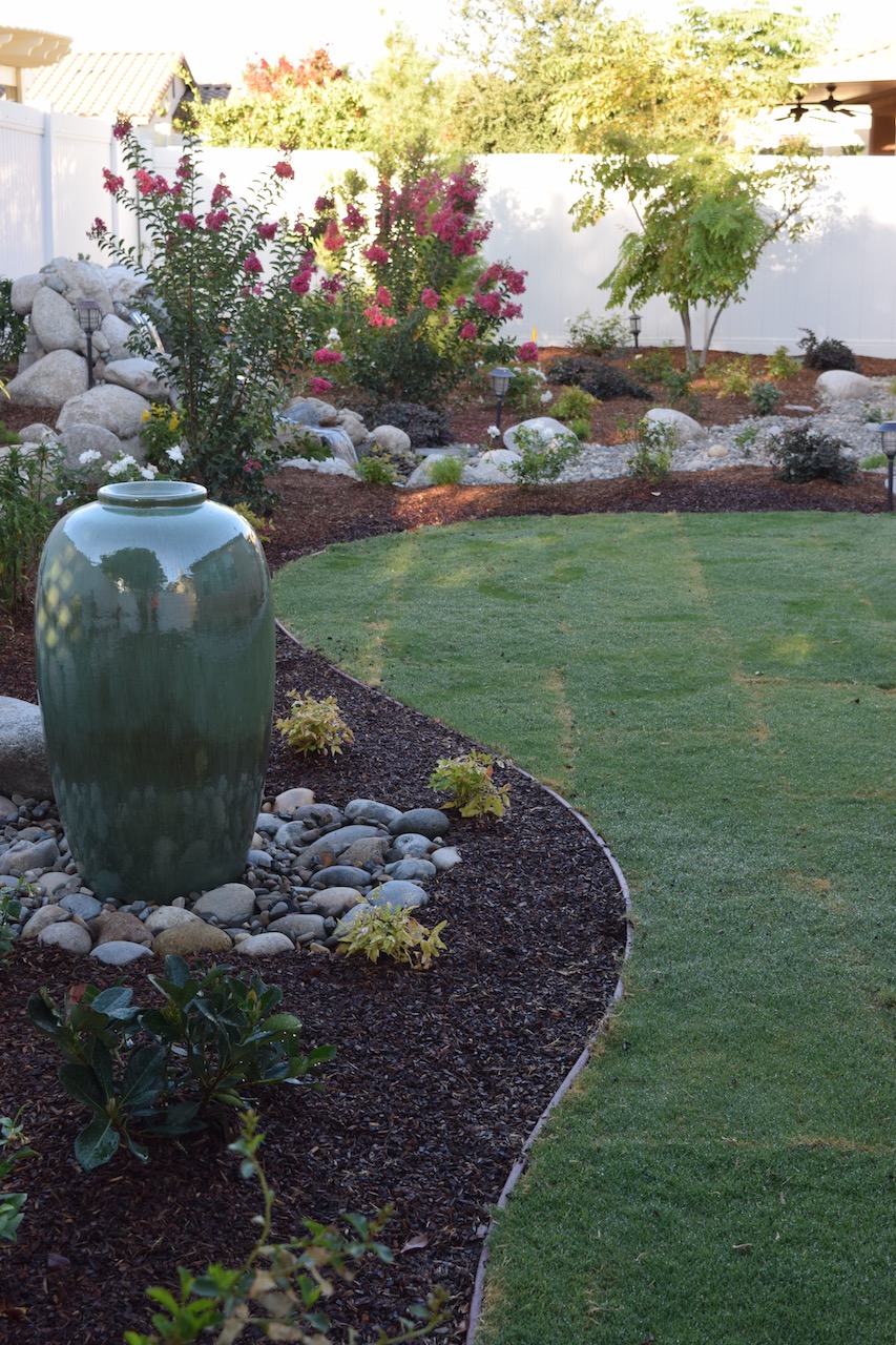 Next, we removed all of the old shrubs & plants to make room for our new planting palette. Our client loved bright colors, so we filled the garden design with bright pinks, reds, & yellows. In particular, we made great use of Tecoma Stans, a heavy blooming & drought tolerant bloomer that boasts bright yellow blooms nearly all-year-long. In order to add another splash of color to the landscape, we installed a striking colored ceramic pot within the landscape. The richly colored pot became an immediate focal point outside the master bedroom.