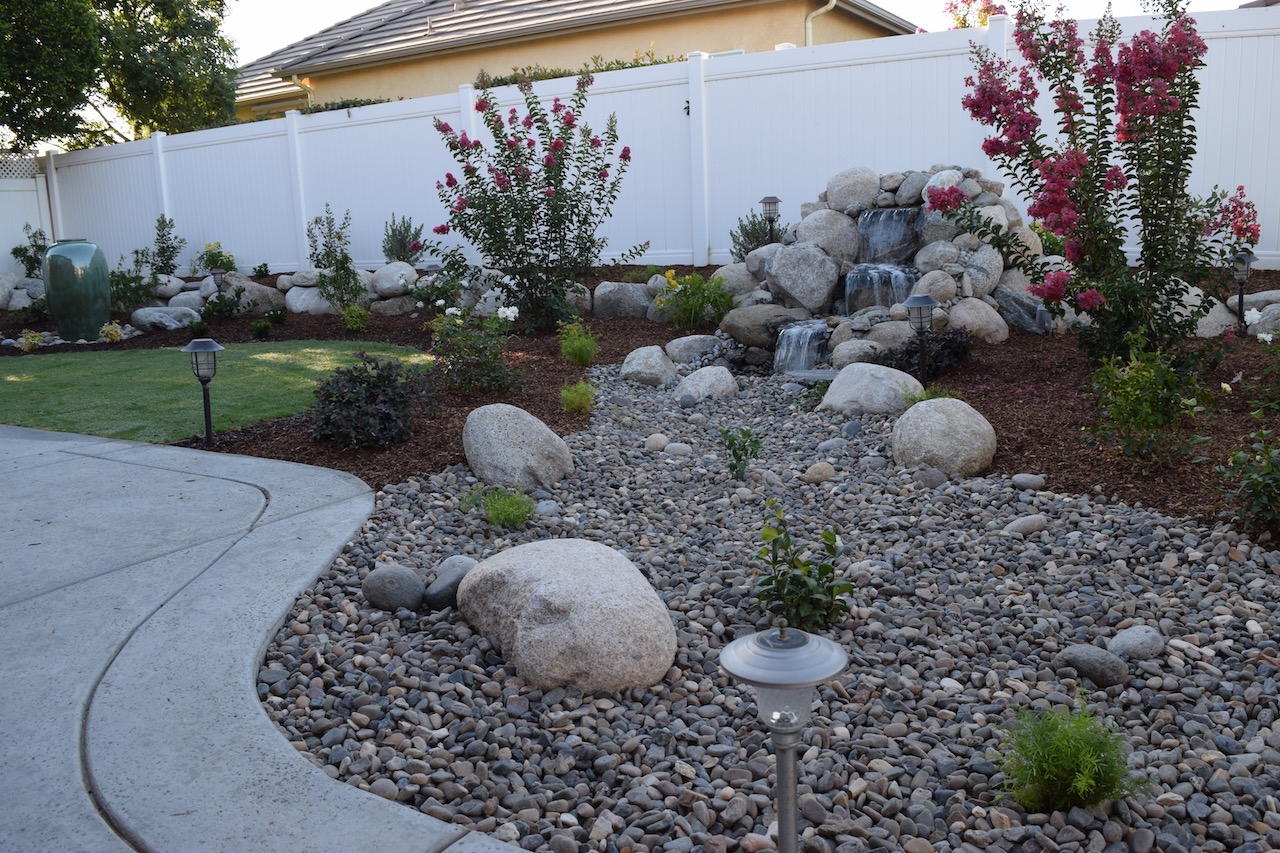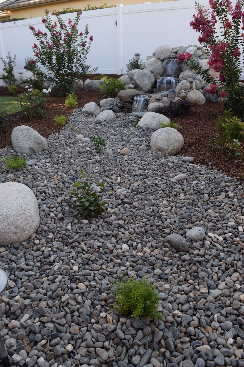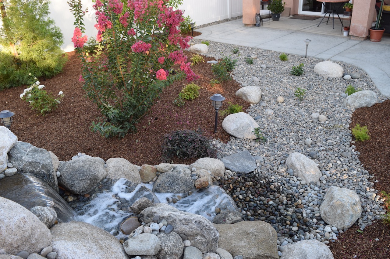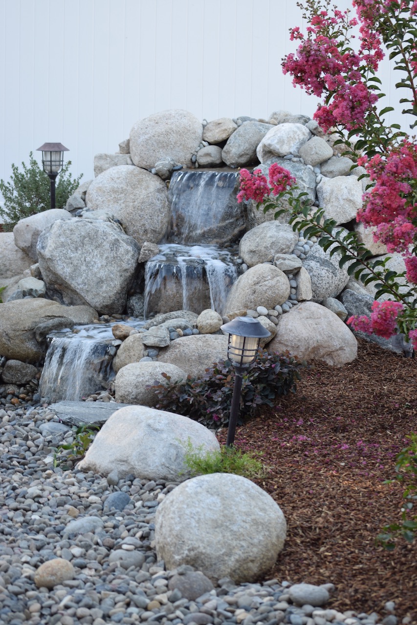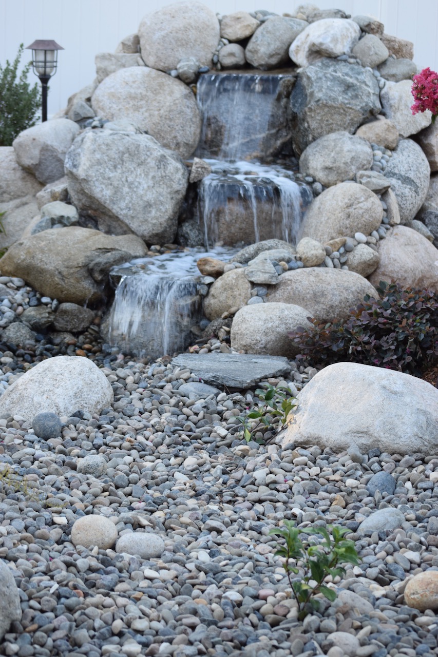 We began the transformation by removing a large portion of our clients’ turf grass to make room for her new waterfall. We created a beautiful, cascading waterfall using the property’s existing slope & brought it into the main view of the living room. We also extended the creek bed of the waterfall towards the patio to give a more dramatic stone texture to the landscape design. We also utilized a rich assortment of stone to create a natural retaining wall at the rear of the landscape.