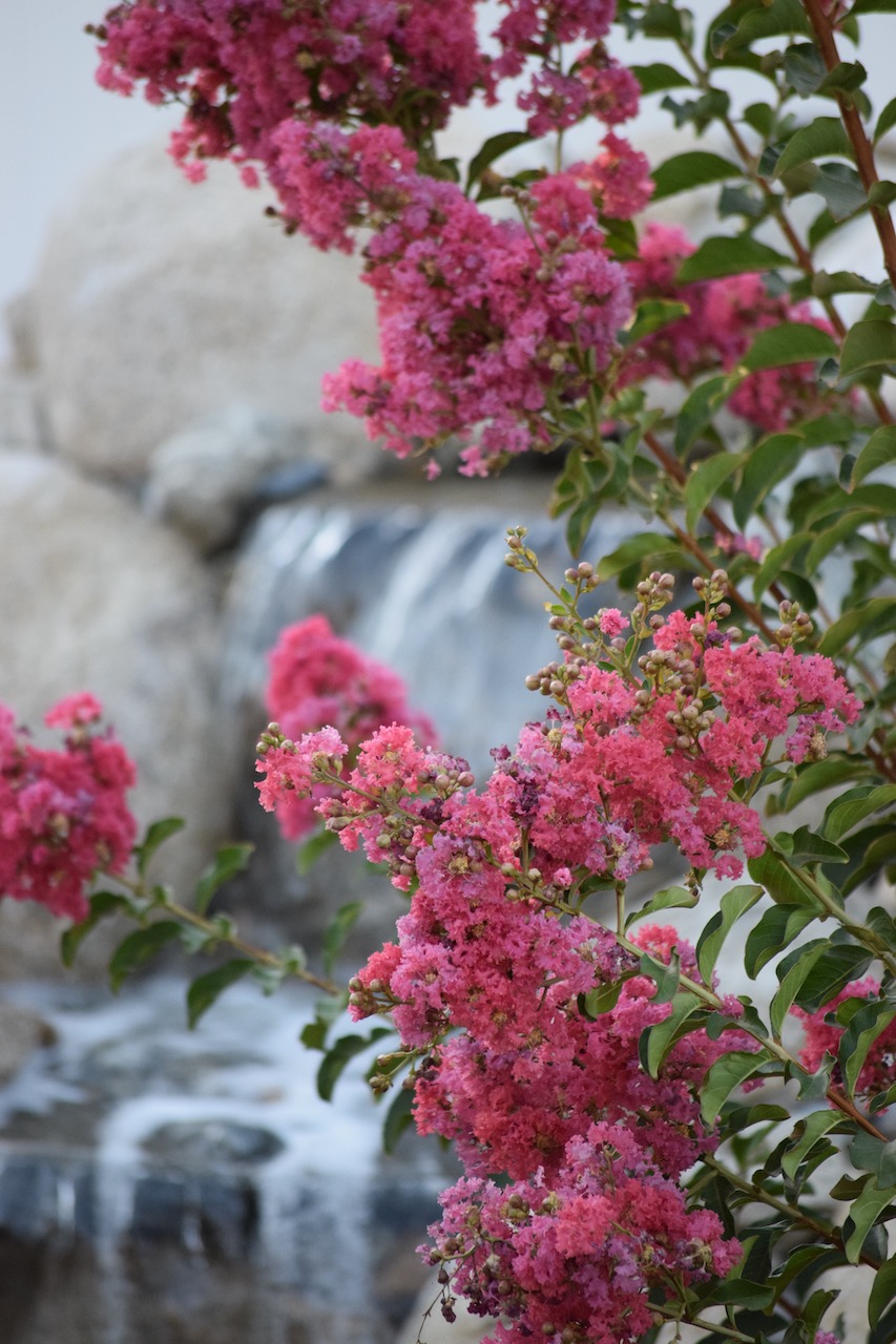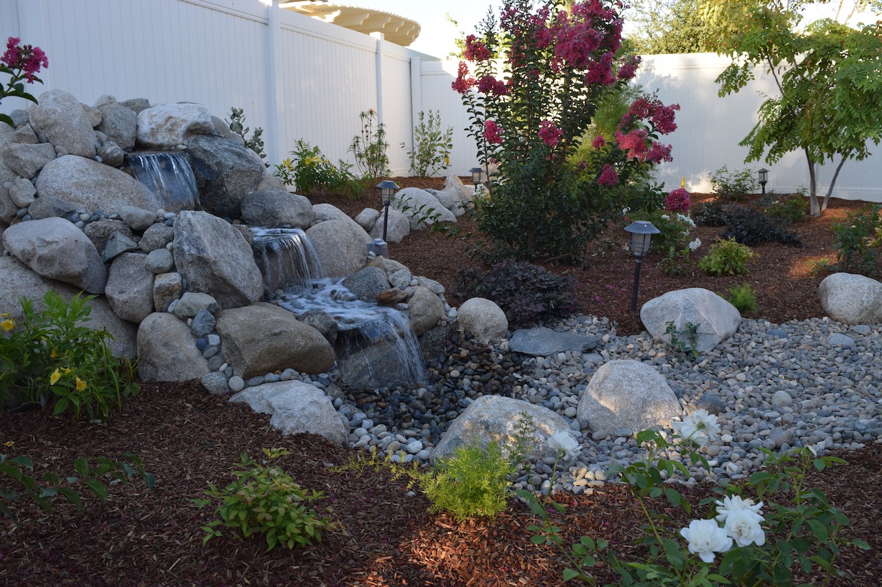 Our client had recently moved into a new home & was sorely disappointed with her new backyard. It lacked any type of character, color or interest. At her previous home, she loved to enjoy her early mornings & late evenings outdoors in her garden. She desperately wanted her new back yard to be just as welcoming & enjoyable. In her dream garden design, she also envisioned a soothing waterfall outside her backdoor.