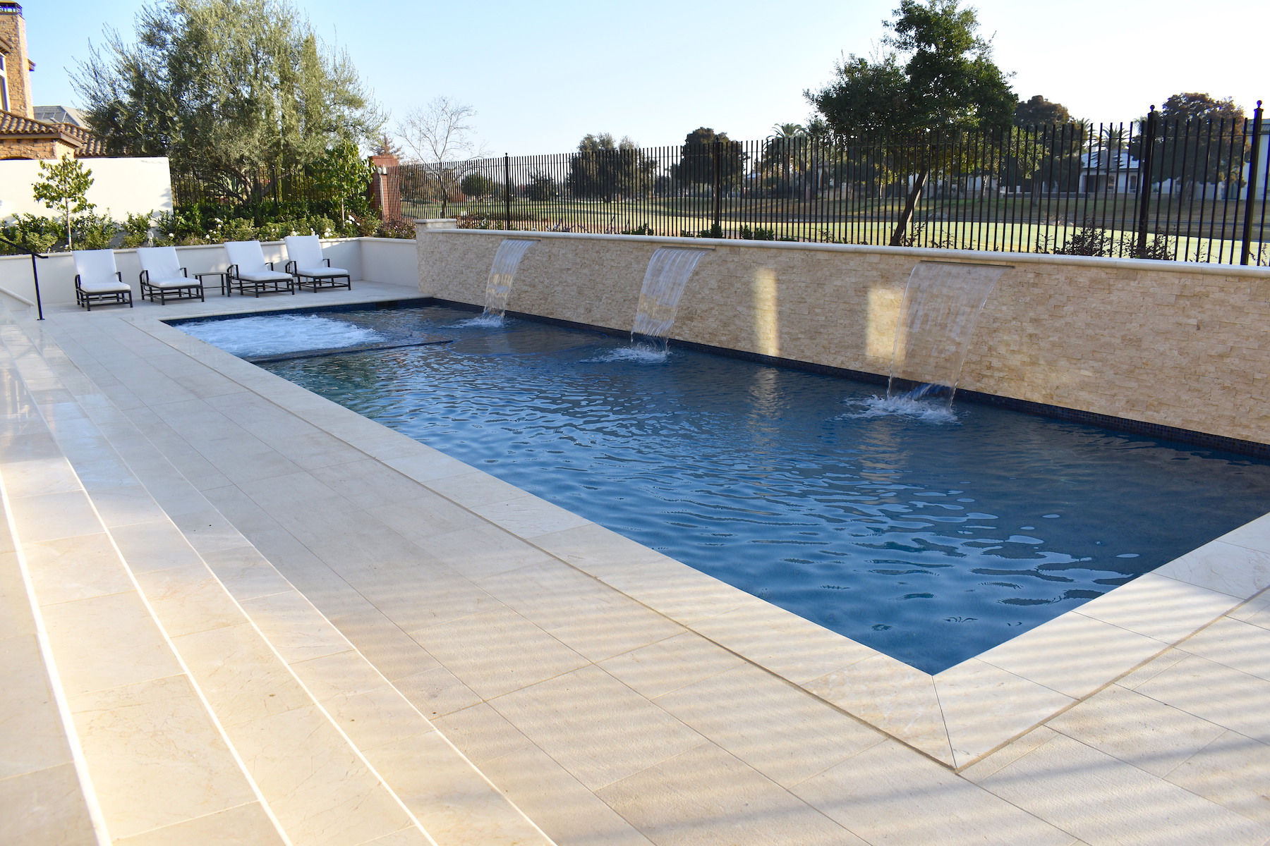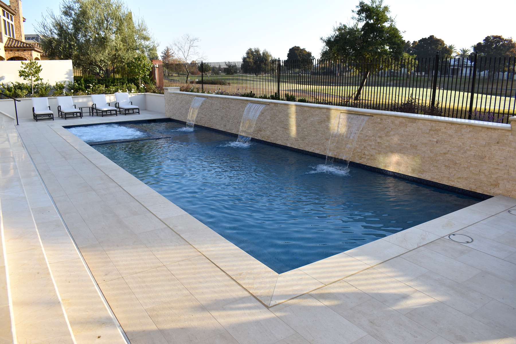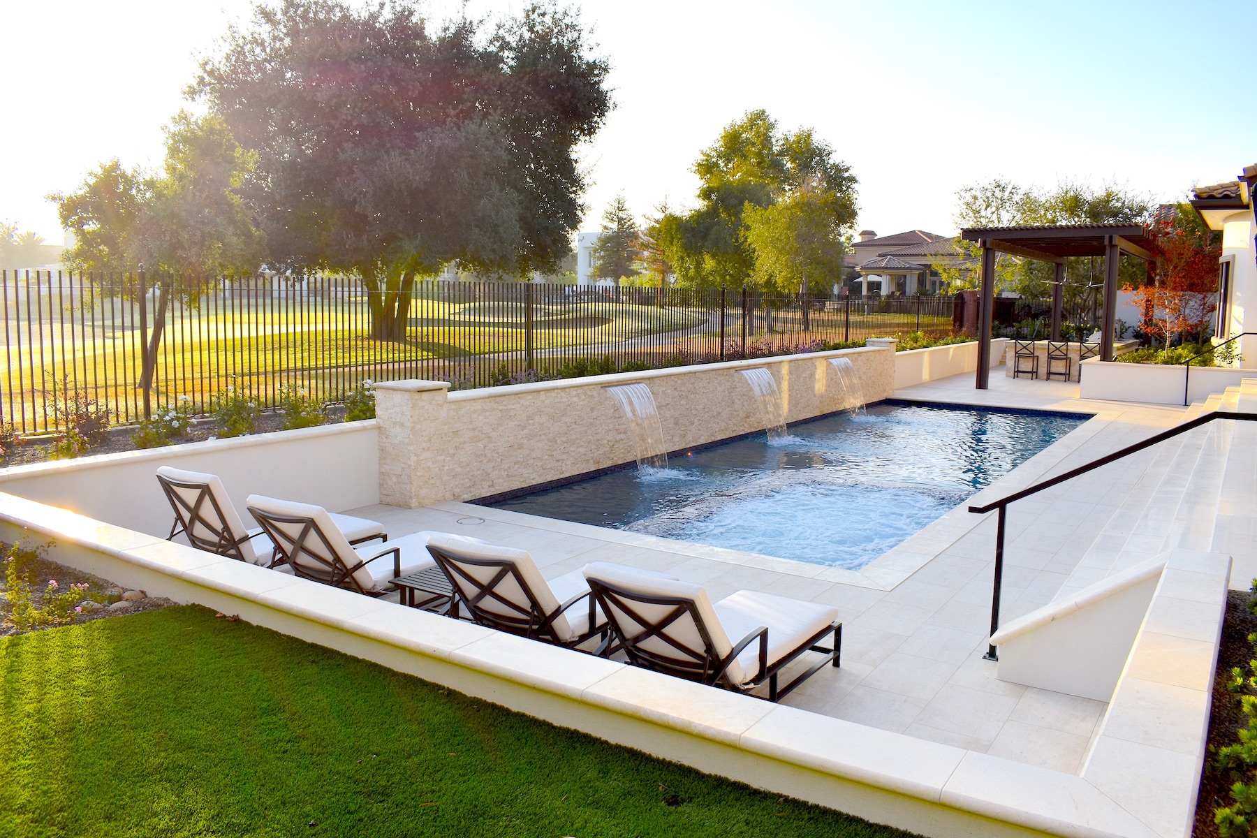 In the rear landscape, our focus was on creating a gorgeous outdoor living space for our clients. The focal point of this area of the design would most certainly be the swimming pool & spa. We created a beautiful, linear pool & spa design that accentuates the width of the lot. In utilizing the retaining walls for the sunken area, we were also able to create a stunning, sheer descent water feature that fills the whole backyard with the sound of falling water. This also creates a gorgeous fountain featured that may be enjoyed from nearly every spot in the backyard.