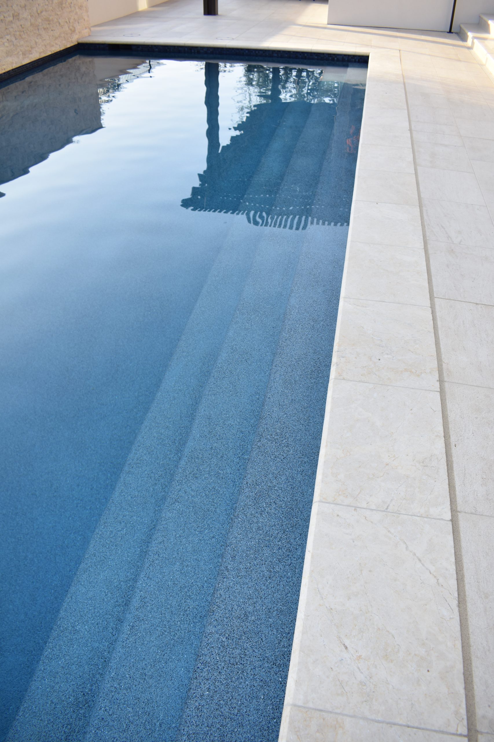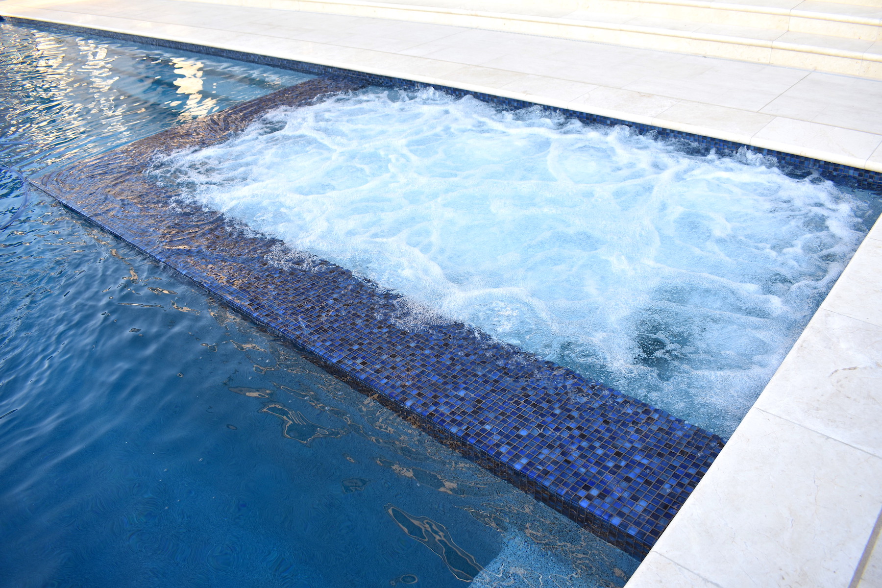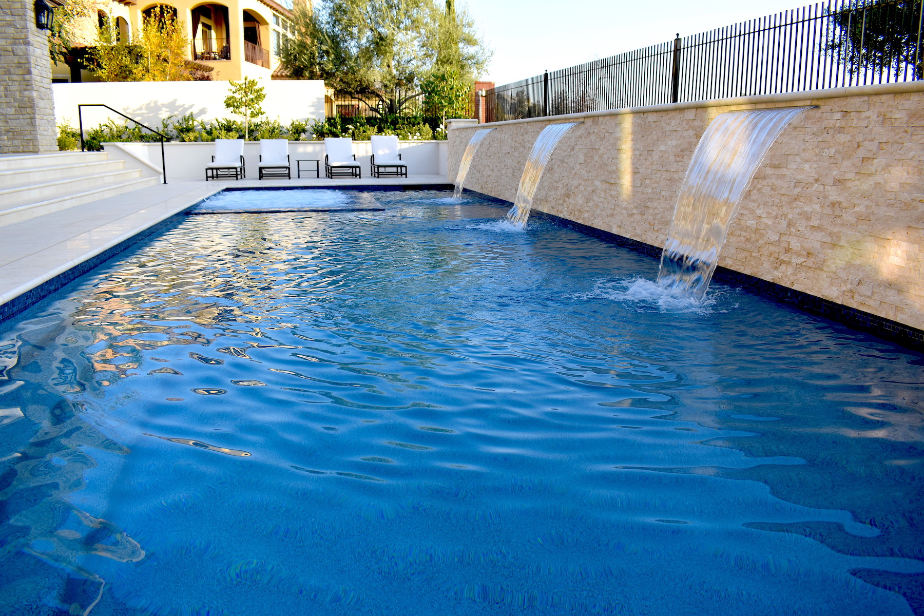 In the rear landscape, our focus was on creating a gorgeous outdoor living space for our clients. The focal point of this area of the design would most certainly be the swimming pool & spa. We created a beautiful, linear pool & spa design that accentuates the width of the lot. In utilizing the retaining walls for the sunken area, we were also able to create a stunning, sheer descent water feature that fills the whole backyard with the sound of falling water. This also creates a gorgeous fountain featured that may be enjoyed from nearly every spot in the backyard.