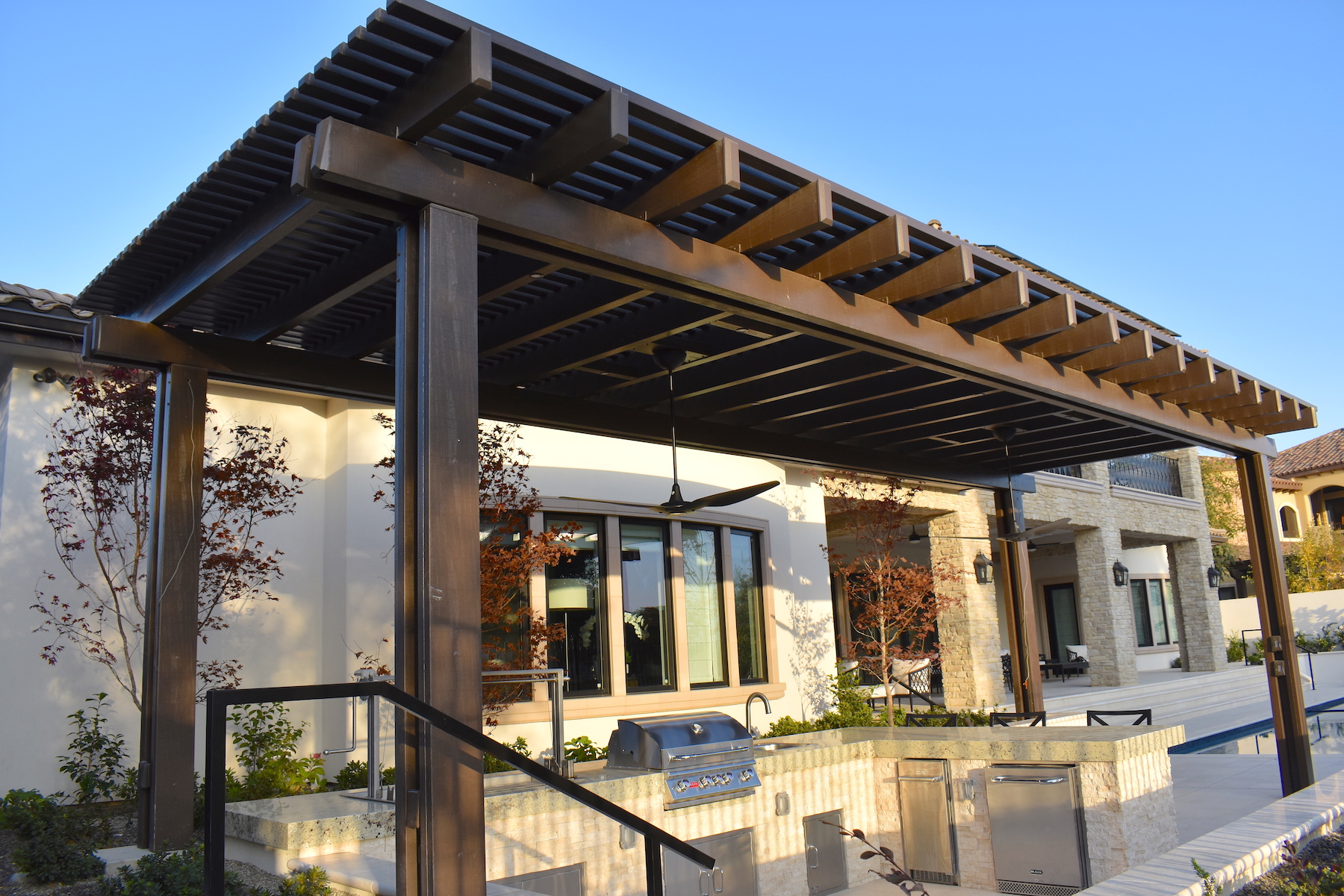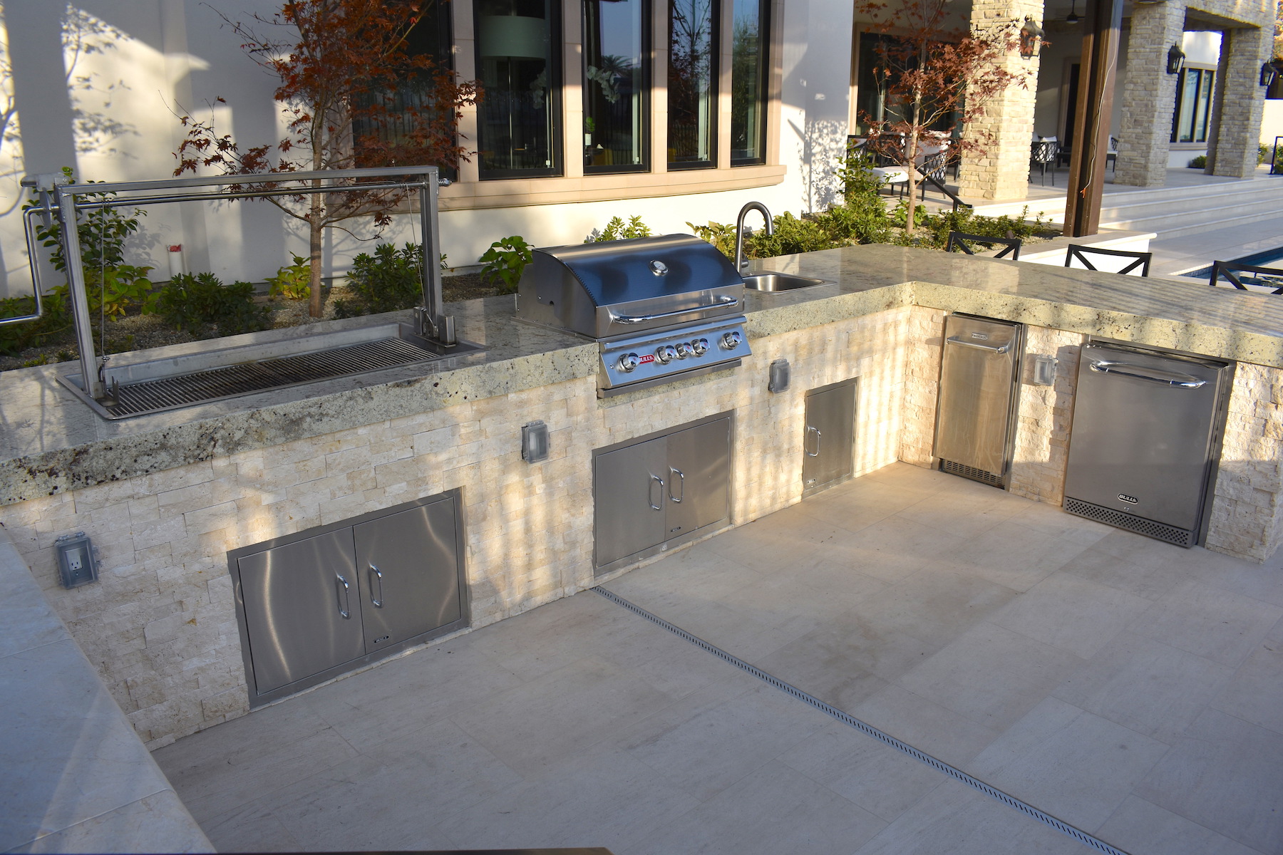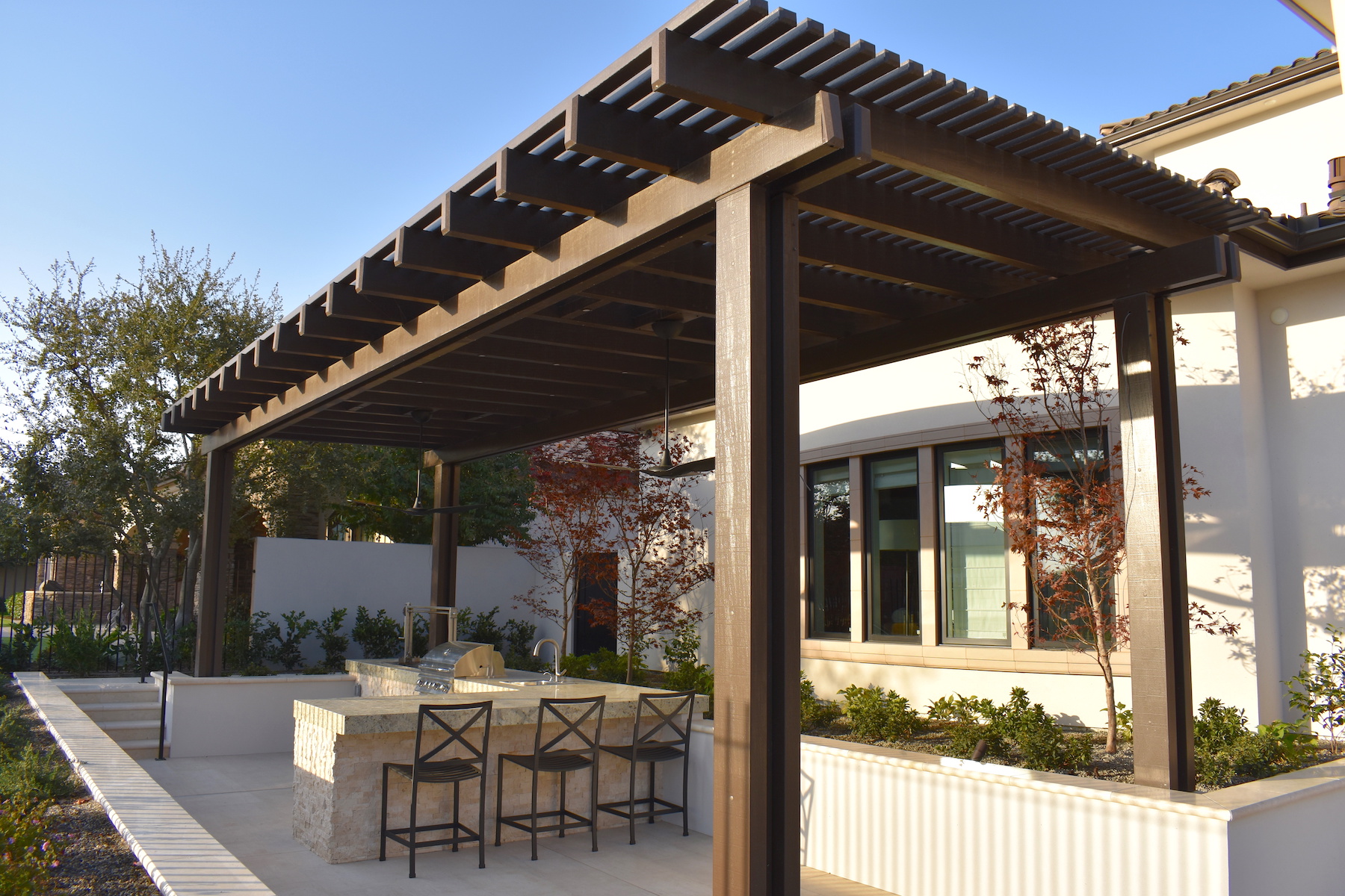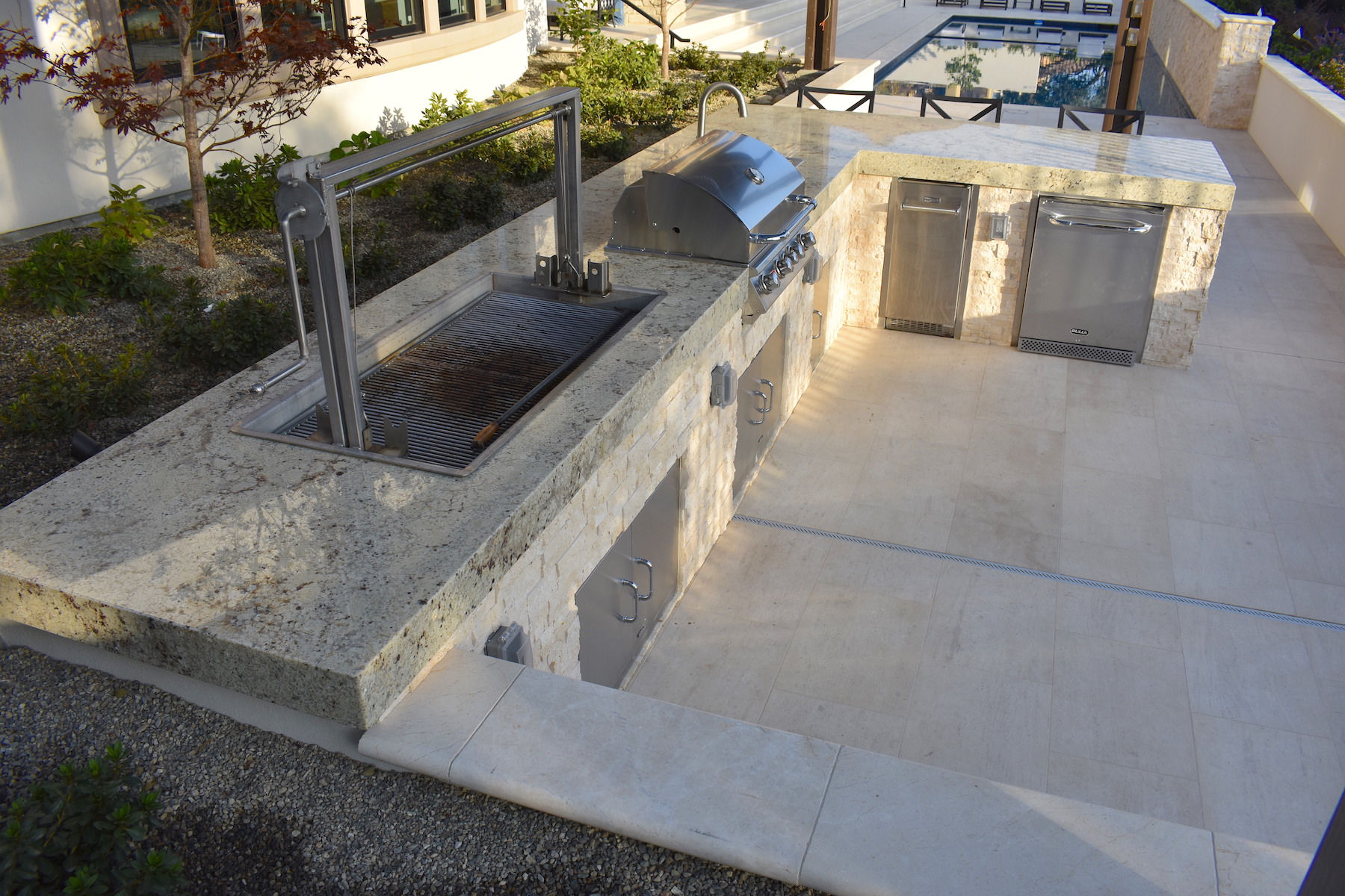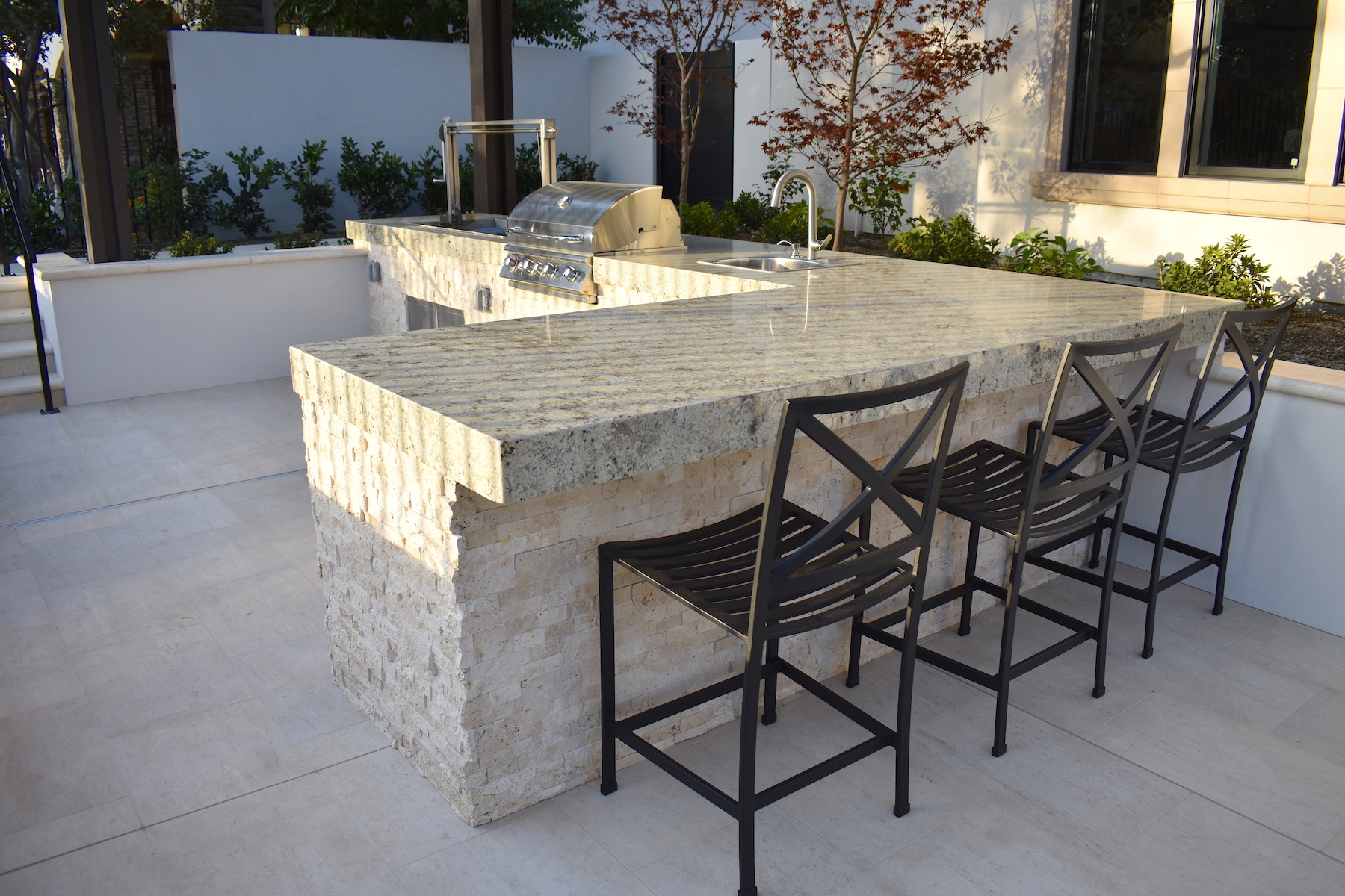 Moving on from the swimming pool & spa, we set out to create an outdoor kitchen space that would fit the aesthetics & our clients’ cooking needs. We again incorporated a natural stone veneer to match the pool’s fountain wall & also used a rich granite countertop that is simply stunning. The outdoor kitchen island offers bar seating for guests & for our clients’ there is the option of a Santa Maria style grill or a traditional gas grill for cooking. Overhead, we constructed an open & airy lattice pergola to provide shade for the outdoor kitchen island.