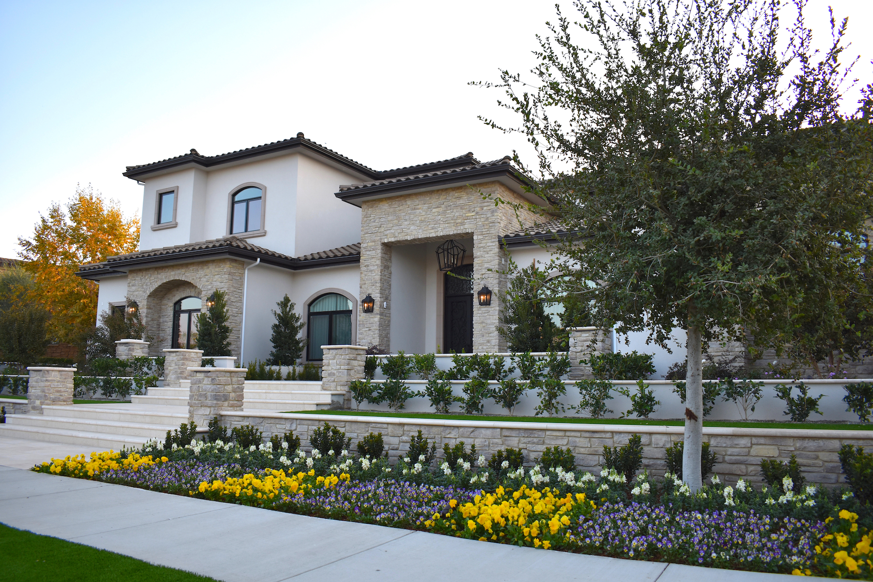 In the front landscape, we used a combination of synthetic turf & hedges to give a simple, yet beautiful design. For color & impact, we created two large annual beds that would be filled with seasonal color. This gives our clients a dramatic planting space to always have something in bloom. We used a combination of Japanese Blueberry & Oak trees for the evergreen species. For blooming trees, we incorporated a series of Crepe Myrtles to bloom against the hot western exposure.