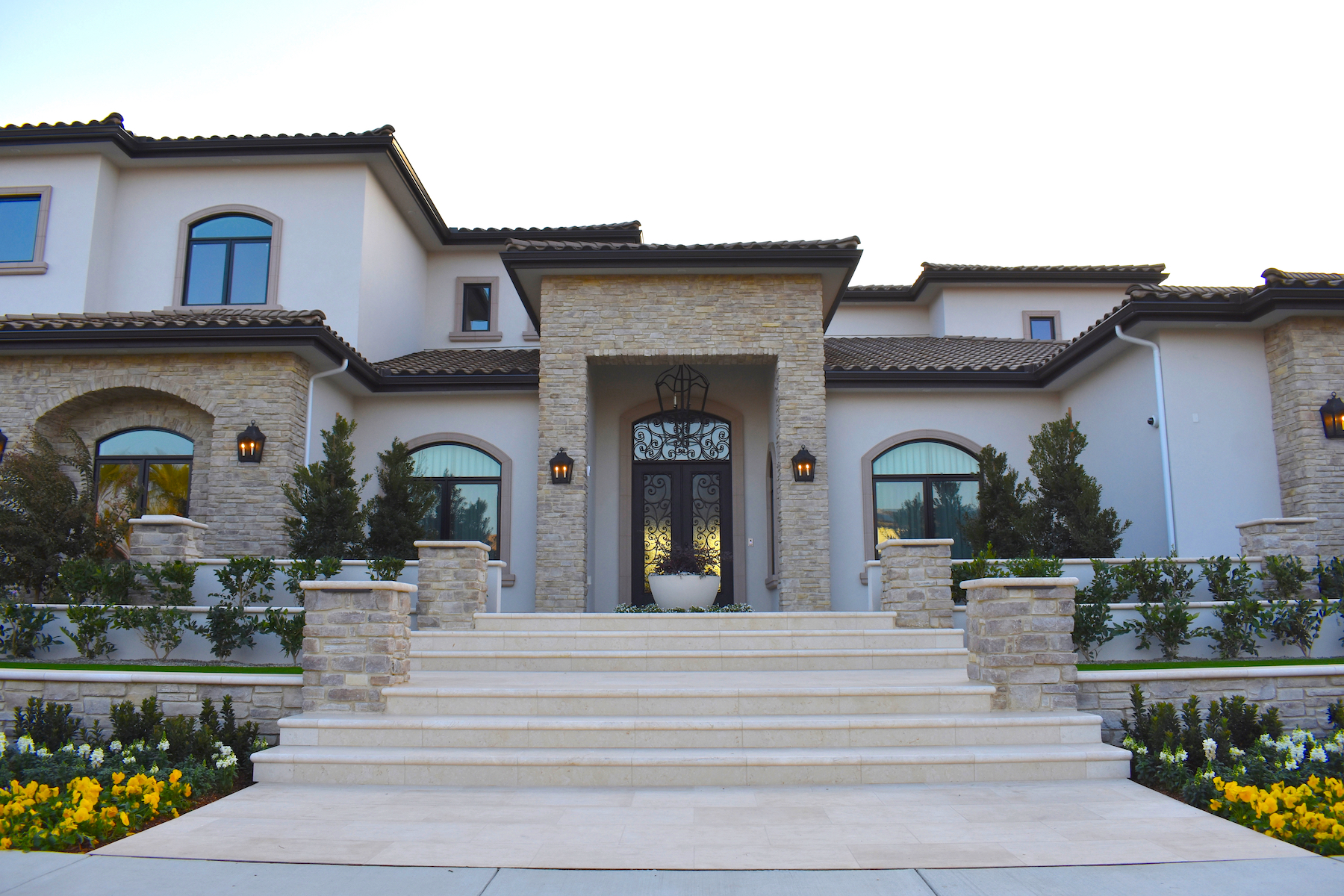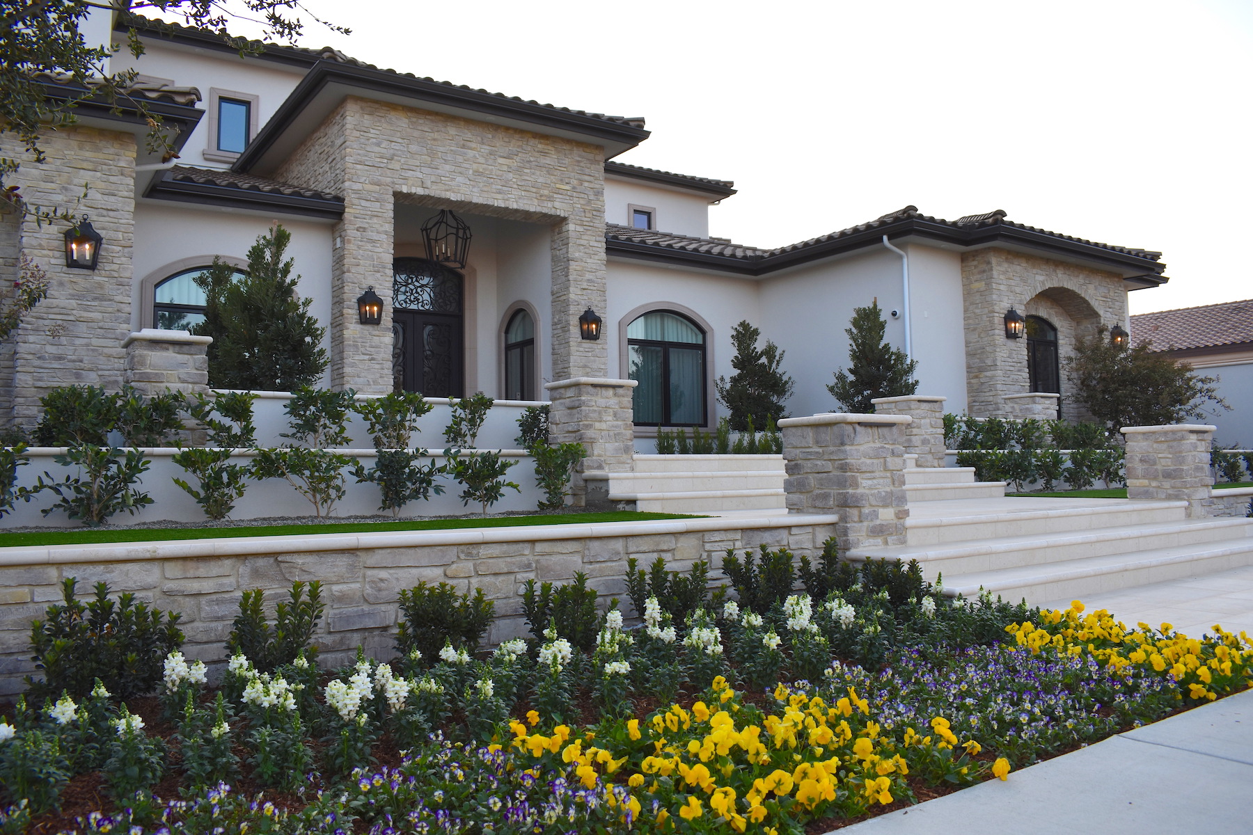 From the very beginning, elevations would play a critical role in our clients’ project for a variety of reasons. First, they had always loved the terraced look of many traditional Italian gardens. They envisioned a welcoming series of terraces for the front landscape that would further enhance the drama of their front entry. Also, in the rear landscape, they envisioned a sunken area to lower the outdoor living space & pool space for privacy. To achieve these goals, we created a series of terraces using stucco & stone walls to match the residence. We also incorporated a number of columns with a rich veneer stone (also matching the residence) to add yet another architectural element to the design.