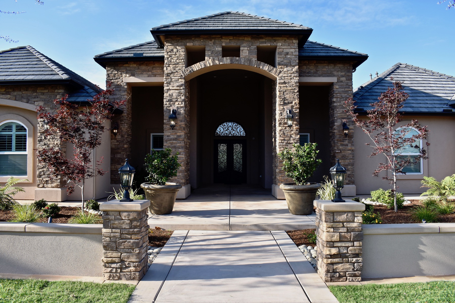 First, we evaluated at the elevations of the lot. In reality, aside from the towering house, the lot was very flat. We knew this had to change. Changing elevations can help to disrupt the flatness of a site & give it naturally more interest. We constructed a series of accent walls & large raised planters to break up the elevation of the site. We used a combination of stucco & stone finish to give the walls a connection to the residence. This variety in colors & textures also creates a beautiful contrast of rugged stone & smooth stucco as your eyes move along the length of the walls. We also incorporated columns near the front entry walk to compliment the home’s grand columns.