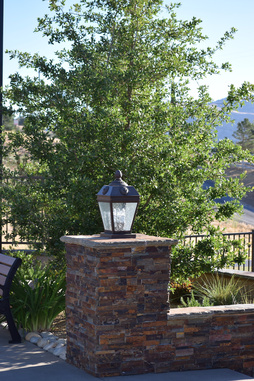 We were nearing completion when our client added one more item for our to-do list: he wanted a dramatic front entry gate that would fit the scale of the newly expanded landscape. We crafted a beautiful, custom wrought iron gate that would span the large approach. We gave the iron gate’s frame a beautiful rolling arch to add a dramatic aesthetic. We used hammered pickets to give the gate more character & used the initial of our clients’ name as a centerpiece. Flanking the new gate, we constructed two dramatic columns to anchor the new piece. We faced these columns with the same natural stone that we used throughout the design & added two large light fixtures to finish the top.