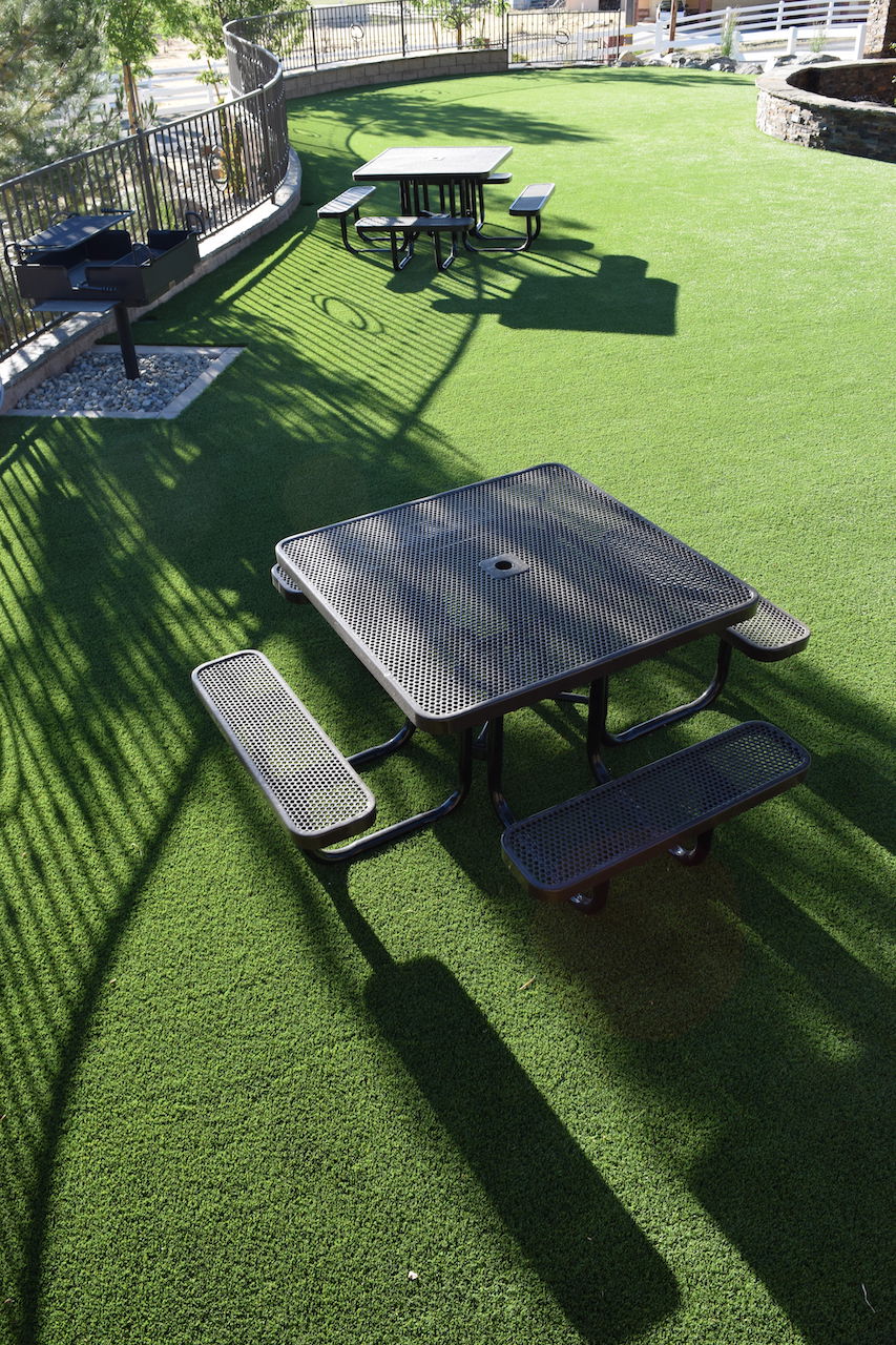 Our clients were clear from the very beginning that they did not want to add more maintenance to this property than was necessary. With this in mind, we opted for a lush thatch of synthetic lawn instead of natural grass. This would eliminate the need for weekly mowing & edging throughout the new landscape area. Also, this would give our park landscape a lush look all-year-long! Our lush artificial grass space meanders across several thousand square feet of space & gives the property a beautiful look from every angle. Next, we installed a massive Santa Maria style grill that fit the park aesthetic & will give our clients plenty of grill space for large family gatherings. We also added authentic park benches & tables to the lawn space & basketball court to complete the park environment.