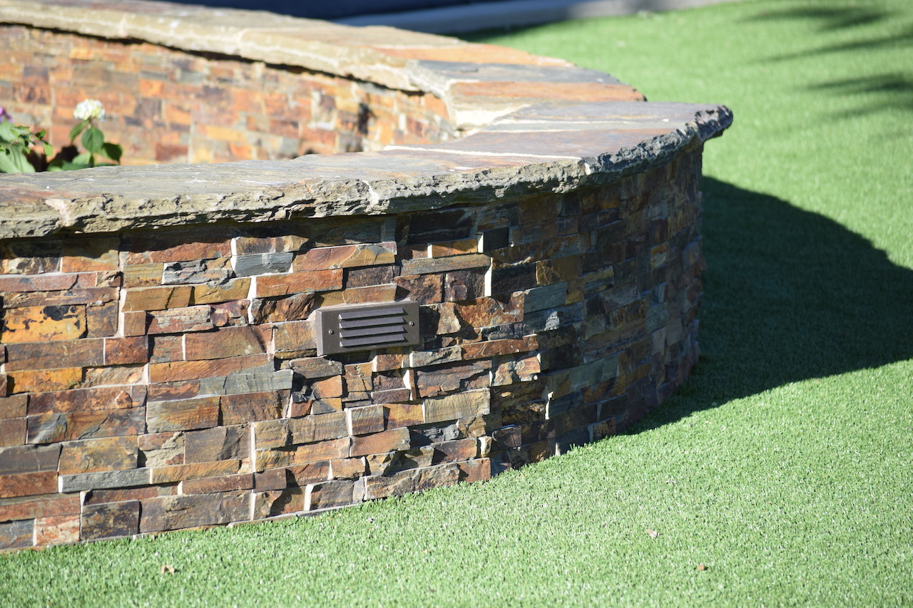 After we finished with the synthetic turf, we began our decorative stone work. Our first focus was on properly highlighting the property’s massive, specimen Oak tree. We decided to encircle the Oak tree with a beautiful, natural stone seat wall. The natural ledger stone we selected has hints of grey & amber tones that beautifully ties into the surrounding landscape. We even added a natural stone cap with a rough edge to give it a more finished look. Our clients loved this cap so much that they had us add it to the split-faced block retaining wall that surrounded the property. In order to visually connect this space to the basketball court area, we added matching columns & a raised planter wall that was faced with our natural ledger stone as well.