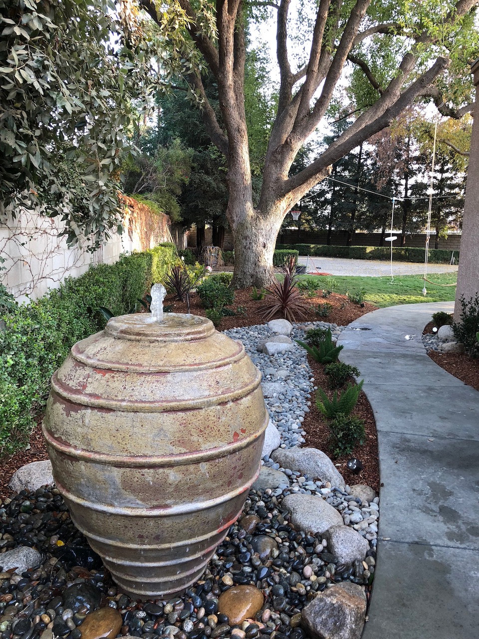 In addition to the outdoor kitchen space, our clients also desperately wanted an updated view outside their main dining room. The window views currently were dominated by block wall & not much else. We gave the planter space a fresh look with updated plantings & incorporated one of our vintage ceramic fountain pots to bring in the relaxing sound/visual of falling water.