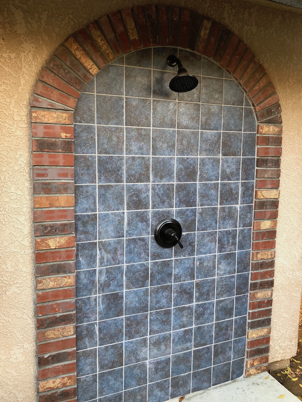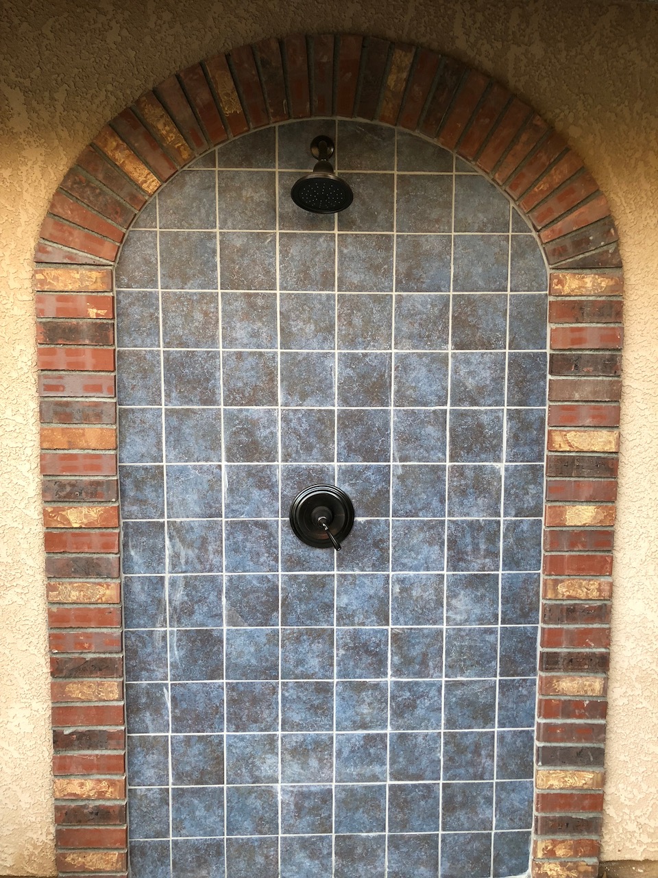Another item our clients had been dreaming of was an outdoor shower near their pool. We used a combination of decorative tile (to match the outdoor kitchen island) & brick (to match the existing architecture) to create their new pool shower. Once it was completed it was as much a piece of art for the backyard as it was a functioning shower.