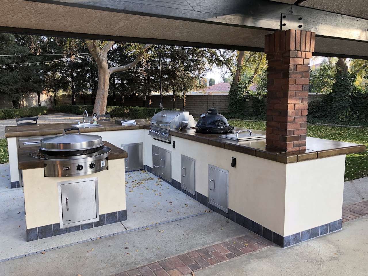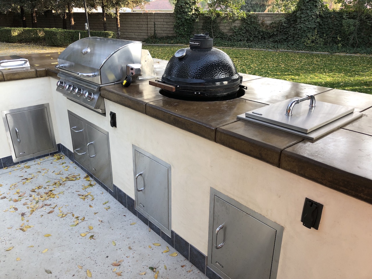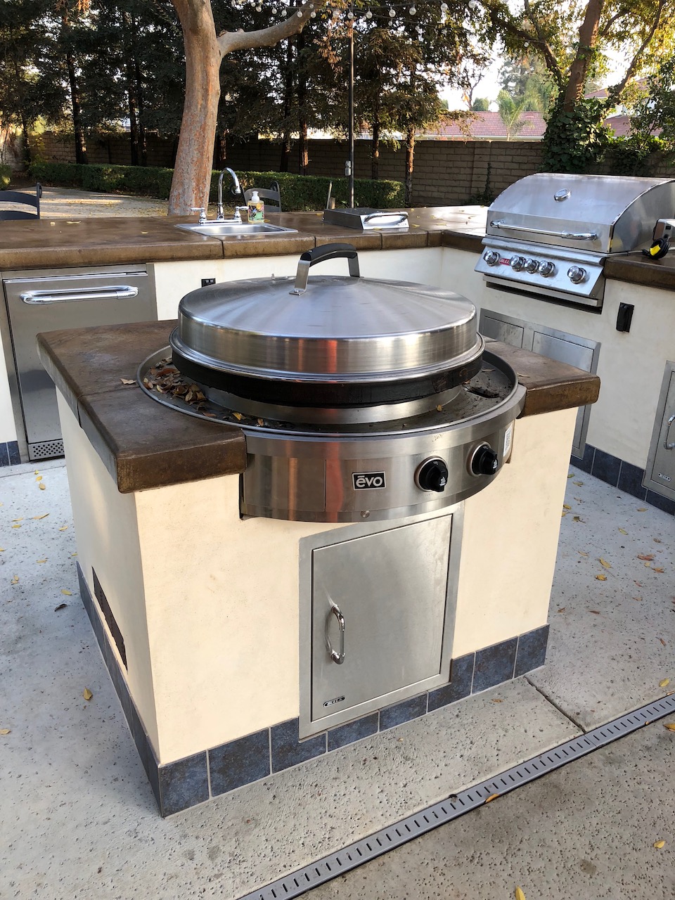 We began by developing a detailed 3D rendering for our clients so that they could fully visualize the dramatic transformation we planned. Our plan was for a spacious outdoor kitchen island that would create a large L-shaped bar within the space. We decided on a variety of cooking utilities so our clients would have plenty of options for their dining experience; this included a 4-Burner Gas Grill, Green Egg Smoker, & an EVO! Our clients fell in love with the idea of having the EVO once they visited our Botanical Garden & Design Studio. We walked our clients through our display kitchen & the EVO immediately jumped out at them. It gives clients a large, flat grill surface to cook anything from steaks to stir fry! At our Botanical Garden we were also able to walk our clients through their material’s selection so that they could easily select the finishes they would like for their new outdoor kitchen island. They ended up opting for a smooth stucco finish with a decorative tile base & a boldly stained concrete countertop.